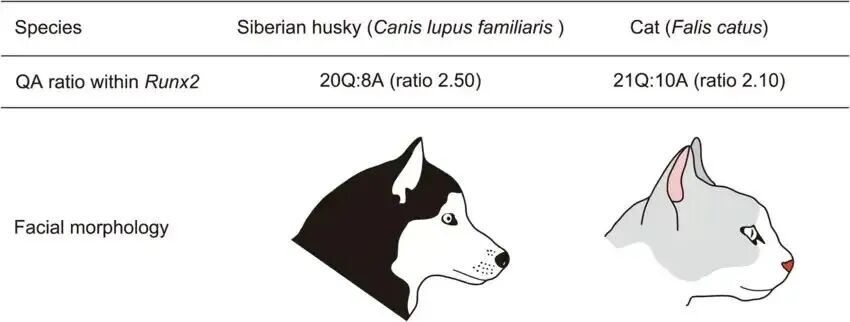 还是拿RUNX2 说,猫的序列大约有 21个 Q 和 10个 A,这个参数几乎是锁死的。在所有的家猫(无论是波斯猫还是田园猫)中,这段序列的长度几乎是 一模一样 的。就像出厂时被胶水粘住了,无论猫怎么繁殖,这段代码的长度很少发生变化。因为长度不变,所以它控制的骨骼形状(如脸长)就保持稳定。