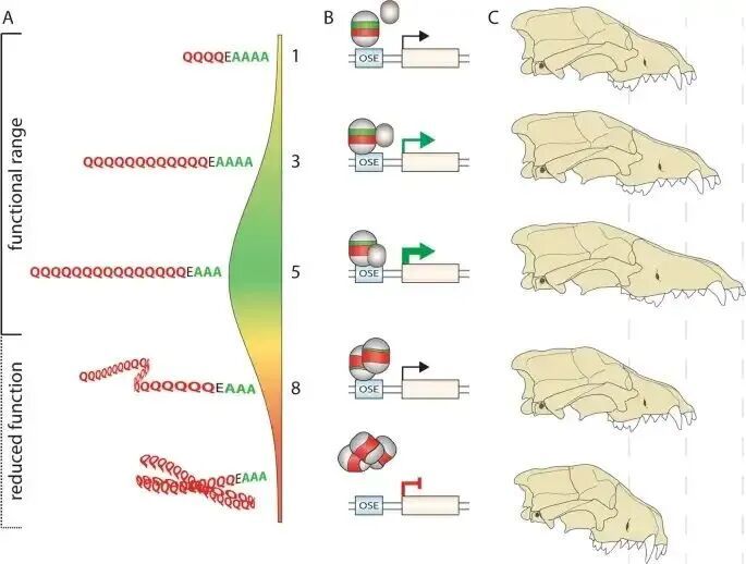 科学家发现,犬科动物的基因组里充满了大量的串联重复序列。这些序列就像是基因里的手风琴,很容易被“拉开”或者“压缩”。比如控制面部形状的 Runx2 基因,里面有一串重复的DNA代码。下为RUNX2 QA 重复序列作用机制示意图: